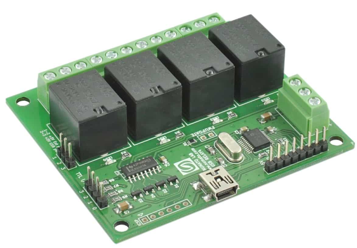 This product has four onboard relays and associated drivers capable of controlling a variety of devices including lamps, motors, locks etc… (Please see recommendations for using this product with inductive loads elsewhere in this document). This module also includes General Purpose I/Os, and analog inputs (multiplexed with GPIOs) that can be accessed over USB interface for extended functionality. The module communicates with host PC over full-speed USB link. When connected to PC, the module will appear as a serial port in Windows Device Manager (or a serial tty device in Linux and Mac).