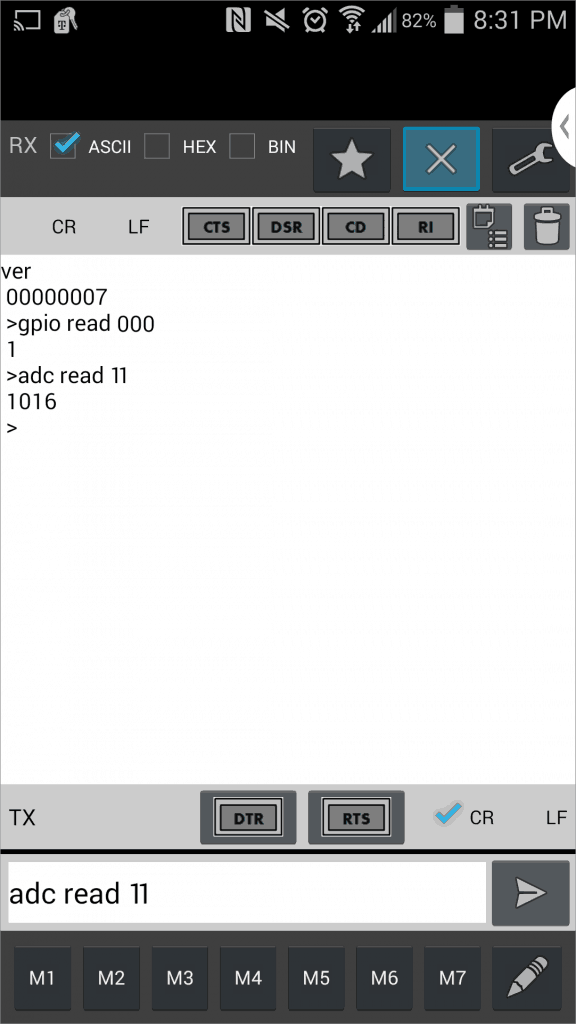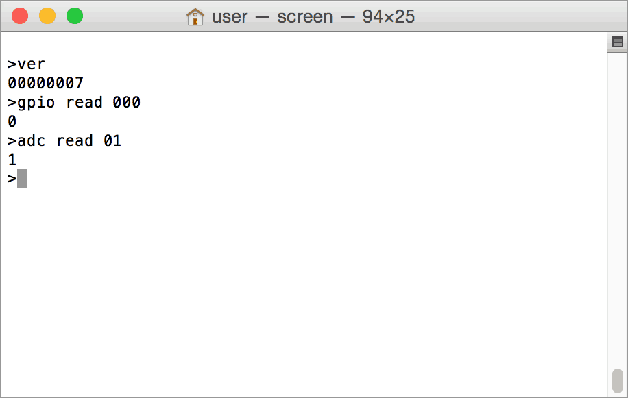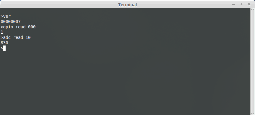 The image below shows the above script running on Windows. Please note the data returned by the device. The device echoes everything that is sent to it in addition to command prompt and an optional result of the operation.
