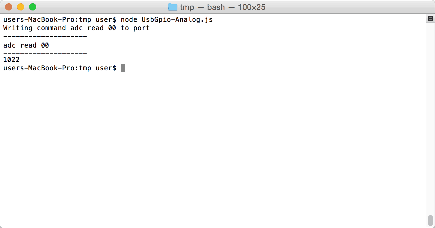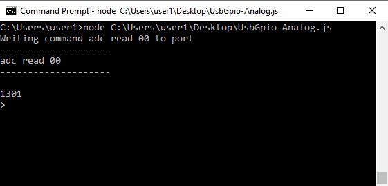 Analog inputs can be read using the same methods provided by the SerialPort module. Only the specific command needs to change and optionally parse the response from the device to extract the actual analog data. The code below shows how to send the command adc read 00 and parse the response to extract the analog data. The data we are interested in is the count returned by the device. javascript’s substr() string function can be used for precise data extraction. Finally, the data, which is still a string is converted to an integer by using Number() function.