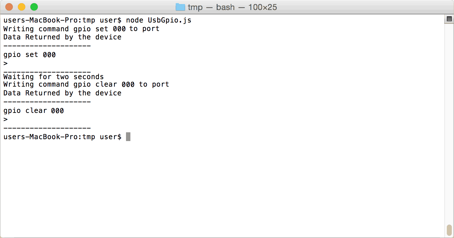 The following complete Node.JS code will open the port and send commands to the GPIO device to turn on GPIO 0 and turn it off after a few seconds.