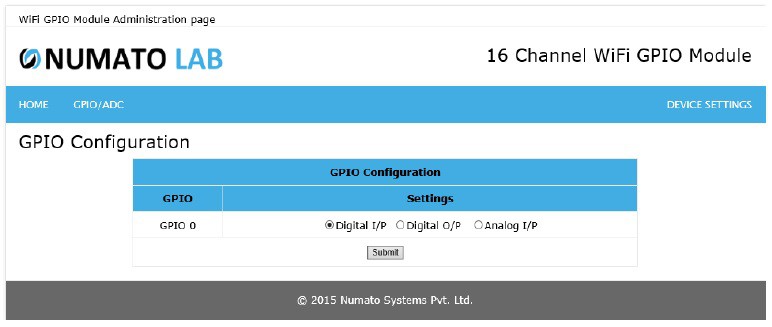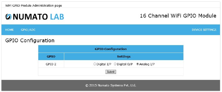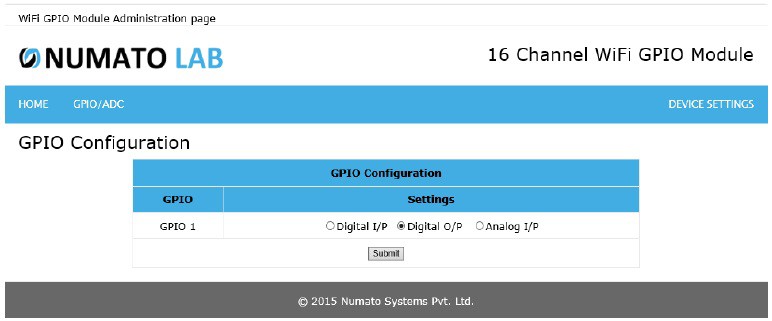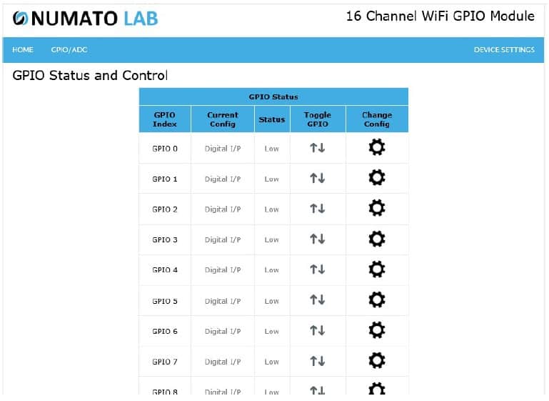 This board has 16 general purpose input/output’s among 14 multiplexed with analog input. Click on the GPIO/ADC link on the menu bar to access GPIO configuration page. The GPIOs can be turned on/off by clicking on the Toggle GPIO button next to the corresponding GPIO.