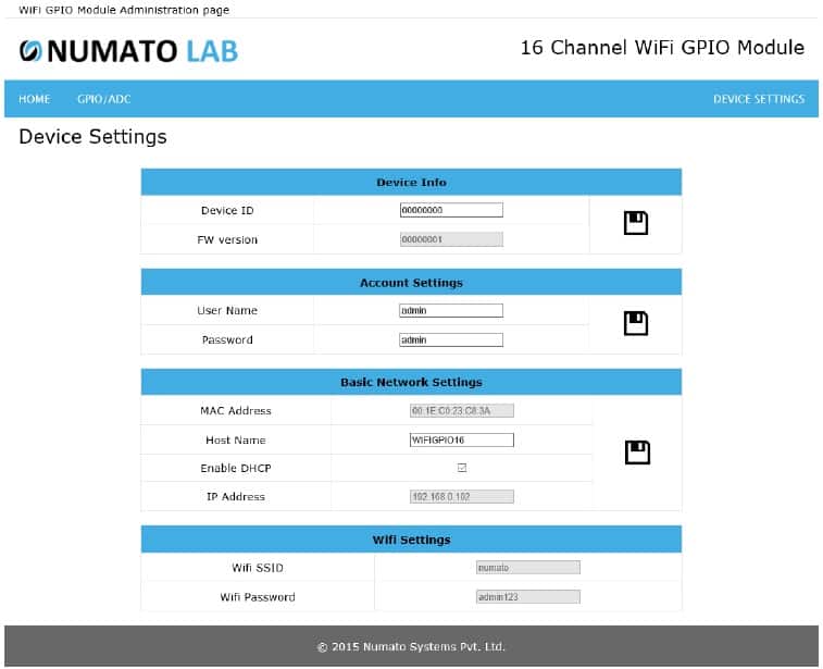 In the above image, firmware version is displayed as 00000001, default device ID 00000000, default User name and Password as ‘admin’. The user can change and save the Device ID, User name and Password as explained in command set or changing the appropriate field on this page and clicking on the save button on right side. The User name and Password can be reset to factory defaults via Factory Reset explained elsewhere in this document. The Basic Network Settings Shows the Device MAC address, Host Name and IP Address. The default host name and IP Address can also be changed according to the user wish. After saving changes the board will reboot with the new network settings. WiFi Setting can’t be changed from here.