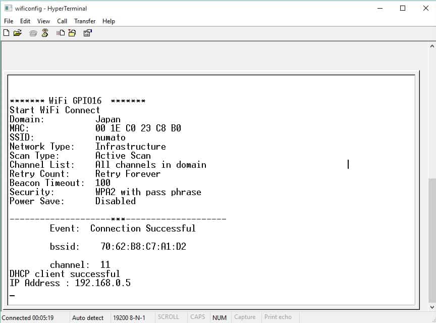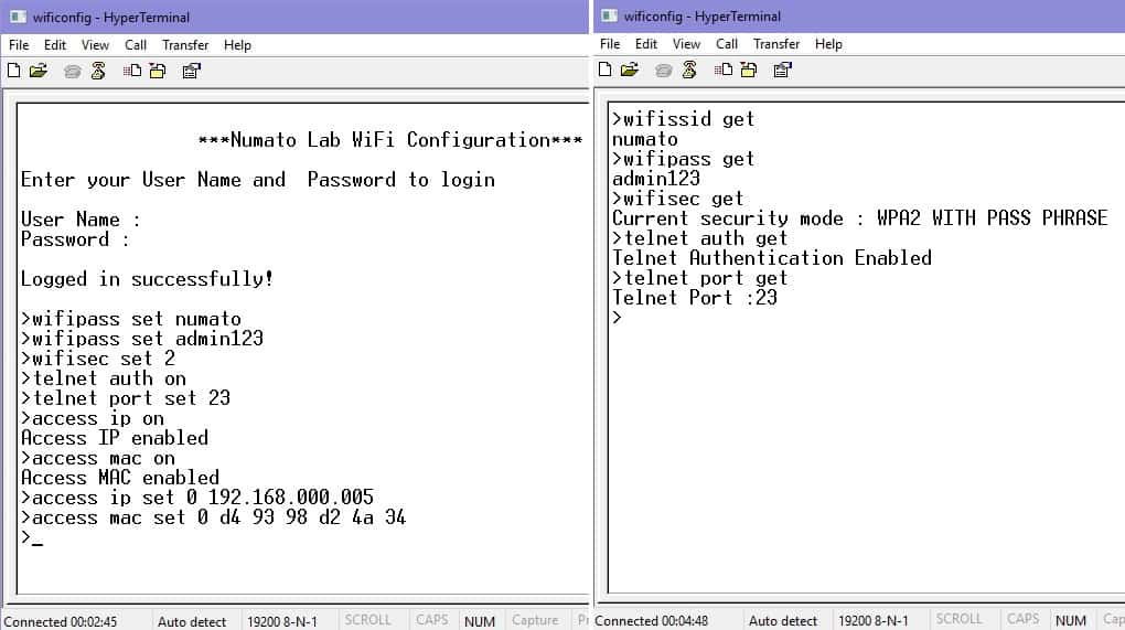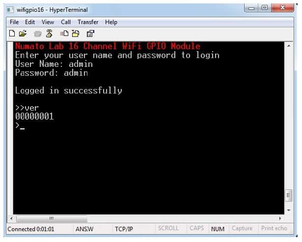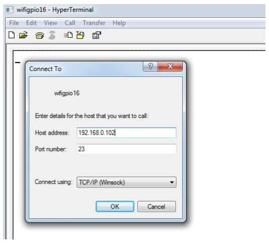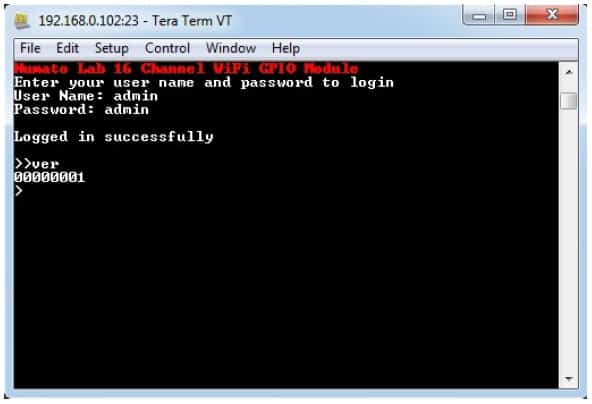 The simple set of ASCII based human readable command set supported by this module makes controlling GPIOs easy via TELNET protocol very easy. The following sections give examples of how to use the module with Hyper Terminal and Tera Term.