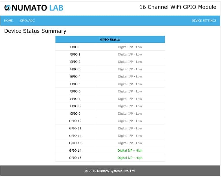 Enter the default User name and Password then click on OK. You will be presented with the device home page that shows the status of GPIOs.