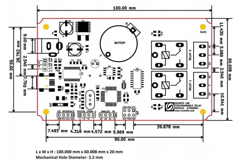 Numato Lab’s 2 Channel Programmable Relay Module is a feature rich product that can be programmed with Arduino IDE. The USB to Serial Chip FT232RL helps uploading sketches quickly to the board. This programmability gives this board ultimate flexibility compared to other relay modules where features depend on the preprogrammed firmware and offer limited customizability. The on board programmable relays, digital I/O’s, analog inputs, Real Time Clock(RTC) and Micro SD memory card slot makes this module useful for learning as well as making sophisticated applications.