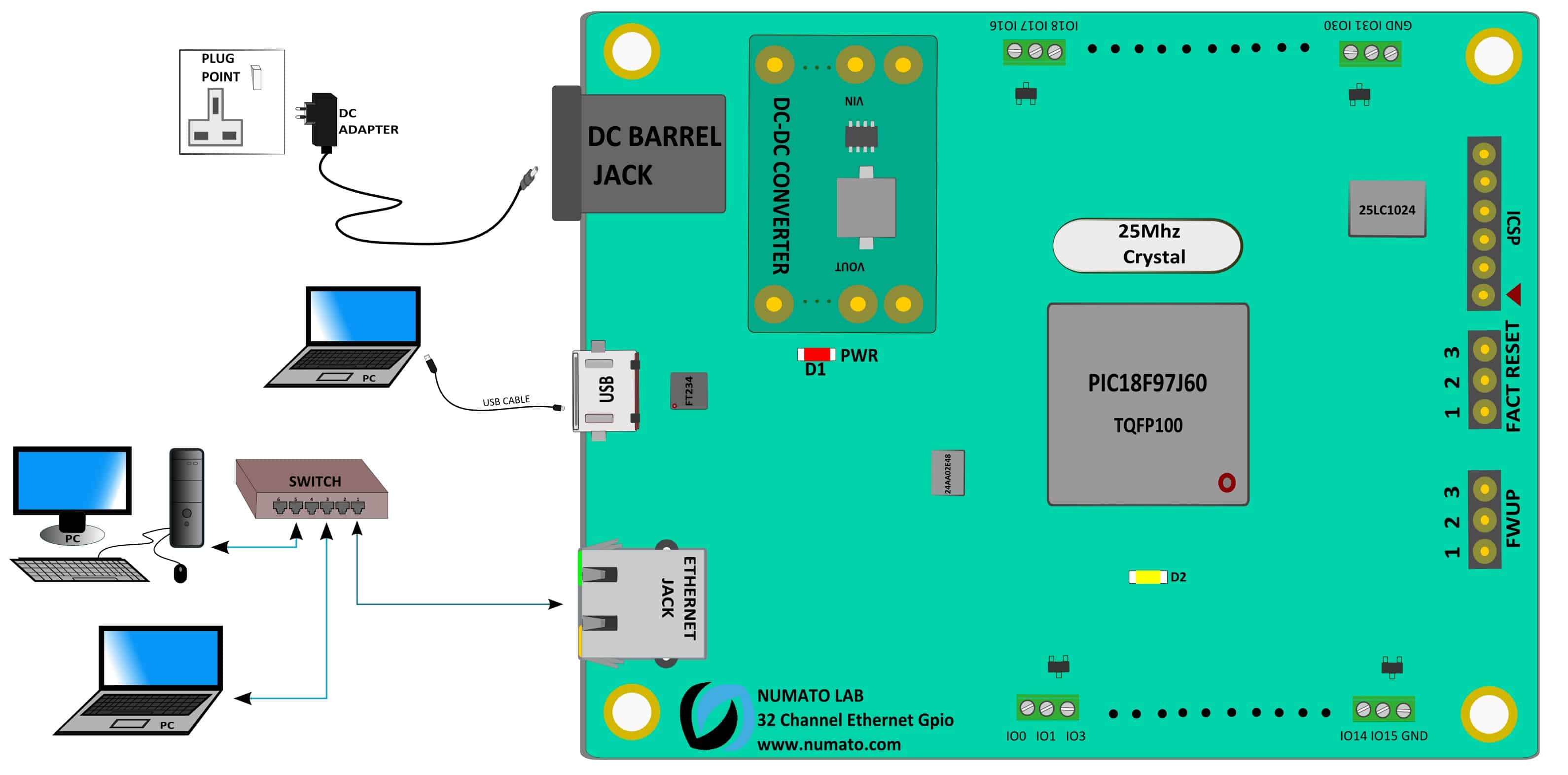 The above image shows the basic connection diagram that can be used in most of the situations. Use a Straight Through Ethernet cable for communication when connecting the board to a switch or router. A Crossover Ethernet Cable may be required in some situations if connecting directly to a PC/Laptop port.