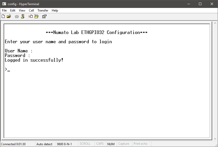 The simple set of ASCII based human-readable command set supported by this module makes controlling GPIOs easy via TELNET protocol very easy. The following sections give examples of how to use the module with HyperTerminal and TeraTerm.