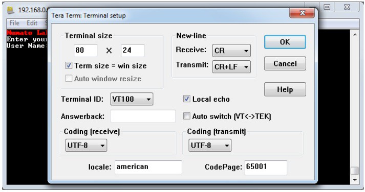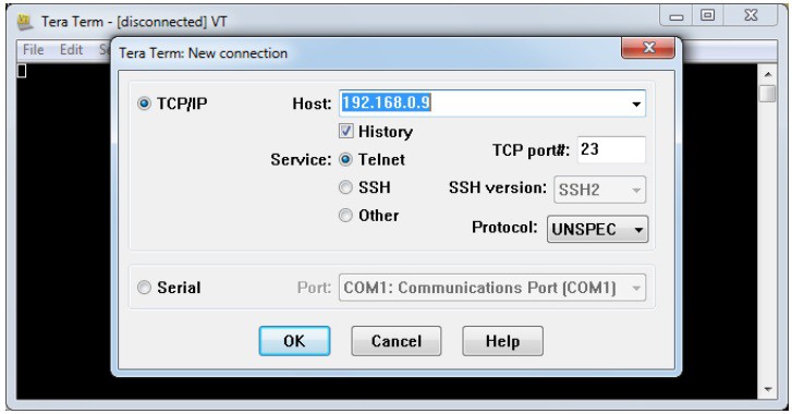 - Run Tera term and type in the IP address corresponding to the module in the “New connection” dialog and click OK.