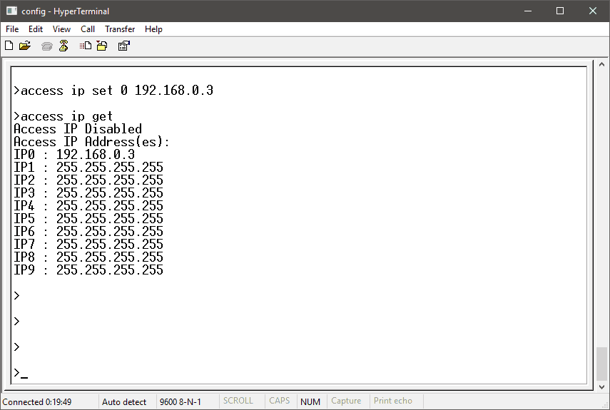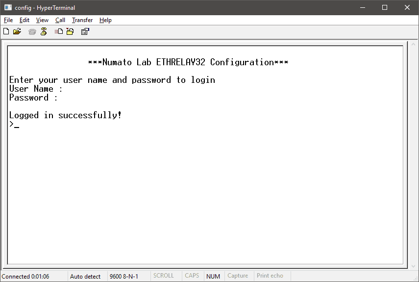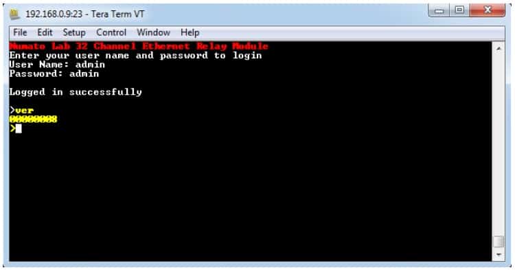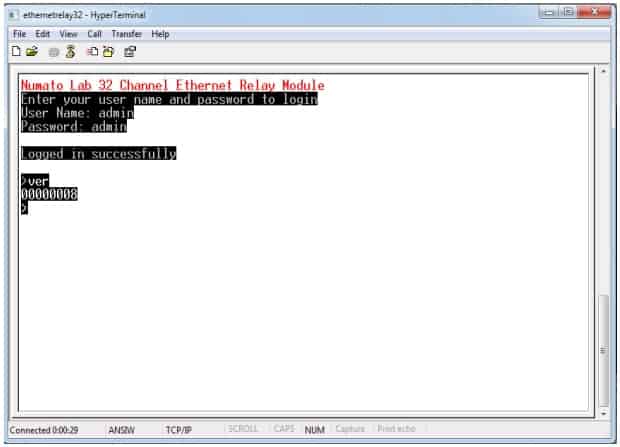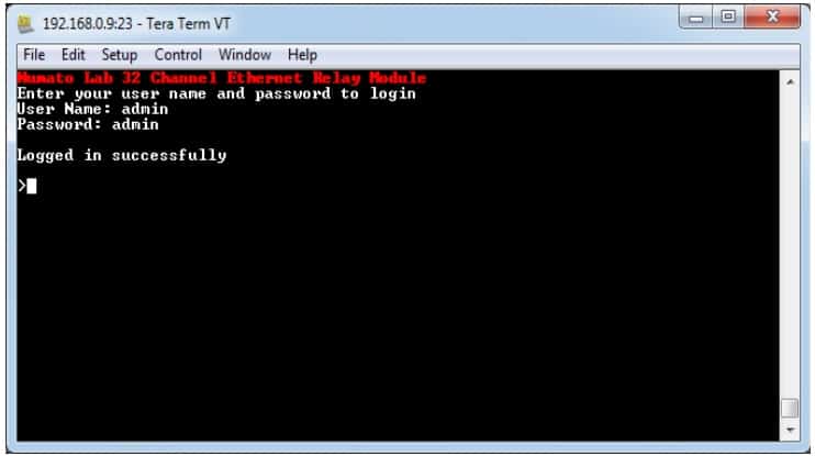 The simple set of ASCII based human-readable command set supported by this module makes controlling relays easy via TELNET protocol very easy. The following sections give examples of how to use the module with Hyper Terminal and Tera term.