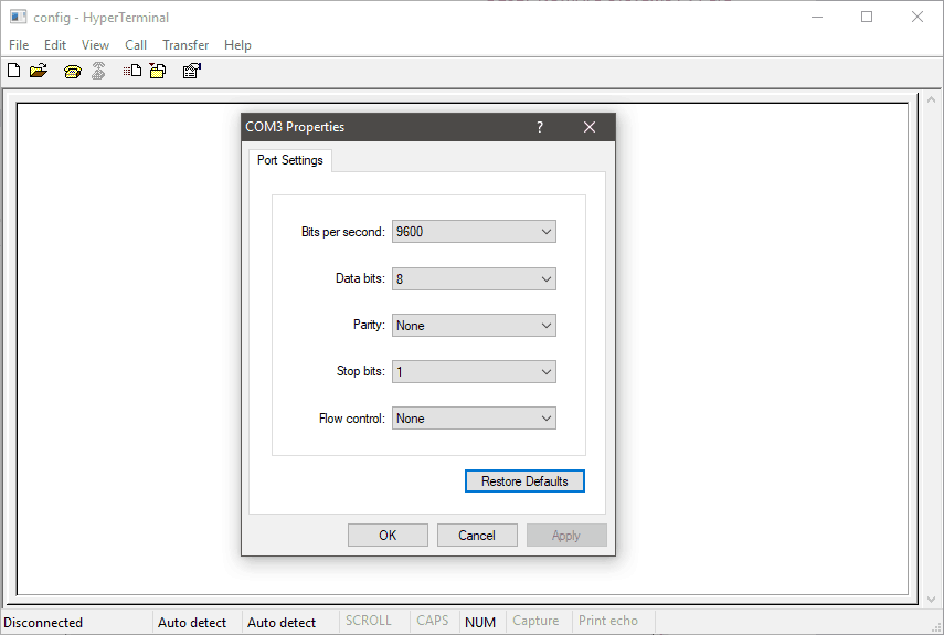 - Open Hyper Terminal and enter the IP address corresponding to the module, leave the port number as 23.