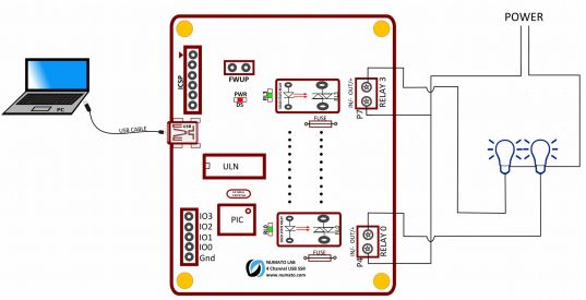 This product has two onboard relays and associated drivers capable of controlling a variety of devices including lamps, motors, locks, etc… (Please see recommendations for using this product with inductive loads elsewhere in this document). This module also includes General Purpose I/Os, and analog inputs (multiplexed with GPIOs) that can be accessed over USB interface for extended functionality. The module communicates with the host PC over a full-speed USB link. When connected to PC, the module will appear as a serial port in Windows Device Manager (or a serial tty device in Linux and Mac).