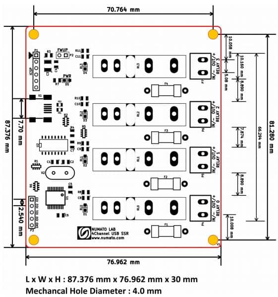 Numato Lab’s 4 USB Solid State Relay Module is a great product for controlling electrical and electronic devices remotely from a PC or Mobile Device over a USB link. Ease of use and wider operating system compatibility are the primary goals behind this product’s design. Built-in USB to serial conversion allows the module to be used without any USB specific knowledge. This simplicity allows the use of off-the-shelf Terminal Emulation programs such as Hyper Terminal and PUTTY for controlling the module with a simple set of human-readable commands. For power users, this module can be controlled by writing programs in various programming languages.