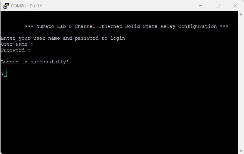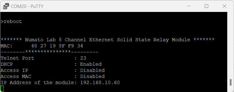 | 6 | reset | None | reset | Reset relays to default state (all relays turned off) |