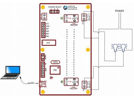The pictures above show the basic connection diagrams for AC and DC loads that can be used in most situations. Please make sure to use a freewheeling diode or snubber circuit if the load is inductive. More details about using inductive loads are available elsewhere in this document. Use a USB A to Mini B cable to connect with a PC. It is important to make sure that the wires used to connect loads are sufficiently rated to handle the expected load current. Exercise caution while working with high voltages. Short circuits can cause damage to the module and the PC.