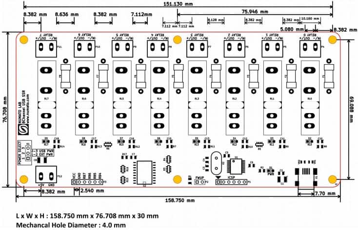 This product has eight onboard relays and associated drivers capable of controlling a variety of devices including lamps, motors, locks, etc… (Please see recommendations for using this product with inductive loads elsewhere in this document). The module communicates with the host PC over a full-speed USB link. When connected to PC, the module will appear as a serial port in Windows Device Manager (or a serial tty device in Linux and Mac).
