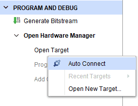 Step 3: Open Vivado project and open the target by clicking on the “Open Target” in “Open Hardware Manager” in the “Program and Debug” section of the Flow Navigator window. Select “Auto Connect”.