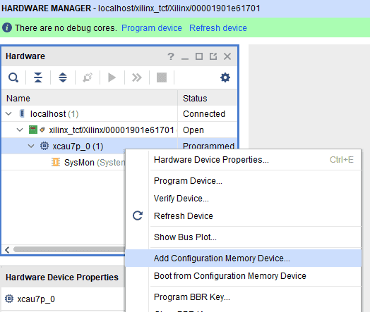 Step 2: If the device is detected successfully, then right-click on the target device “xcau7p_0” and select “Add Configuration Memory Device” as shown below.
