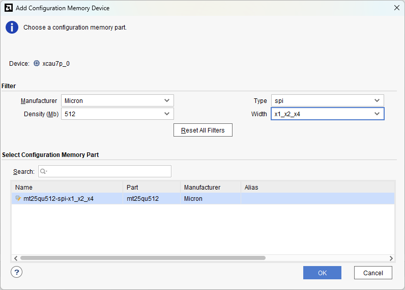 Step 3: Select the memory device “mt25qu512-spi-x1_x2_x4”, then click “OK”.