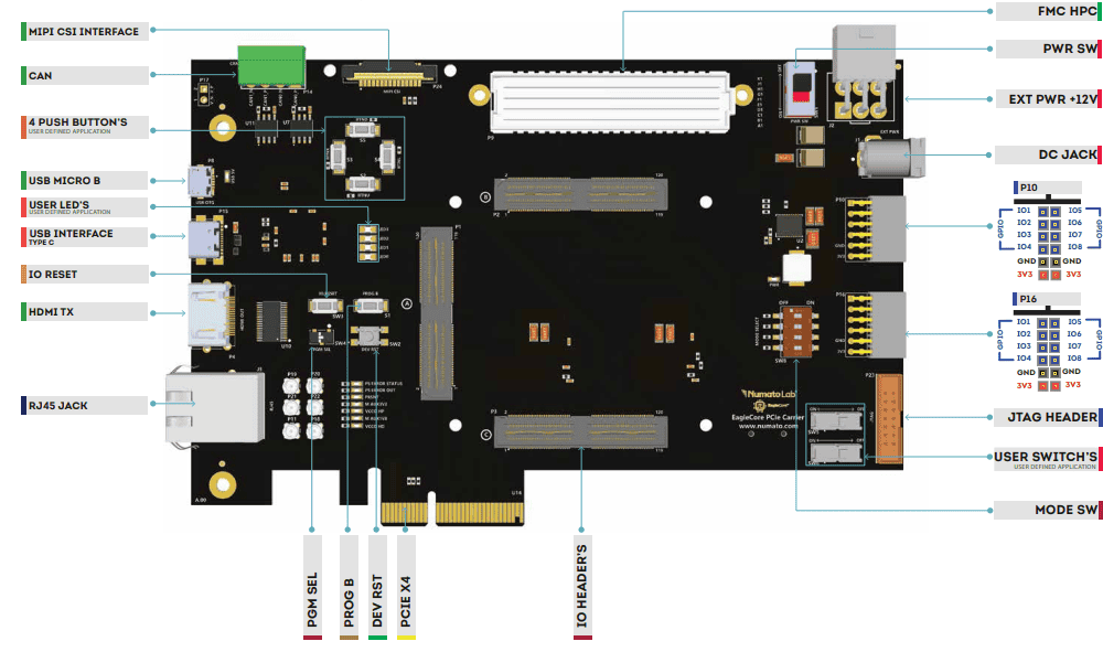The EagleCore ZU01 carrier features a CONN RCPT 120POS SMD GOLD connector, which enables the connection of various AMD SOM modules, such as the EagleCore ZU-Plus SoC, etc. The EagleCore ZU01 carrier includes a High Pin Count (HPC) high-speed FMC connector that has maximum of 4 SERDES lines. This connector allows for the expansion of the board’s functionality by attaching custom or commercially available daughter boards. The EagleCore ZU01 Carrier offers several additional features designed to enhance functionality and flexibility for the user. The carrier board includes an SD card slot, which allows users to add additional memory for data storage or program storage, MIPI CSI-2 (Camera Serial Interface 2) connector, enabling efficient video and data transmission between the carrier board and compatible camera modules and much more.