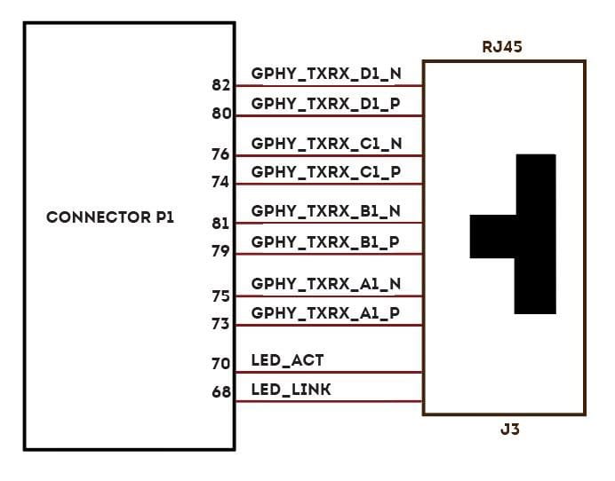 The EagleCore SOM Carrier supports 1 Gigabit ethernet communication lanes (J3)which support 10/100/1000Mbps Ethernet interface. It also has an additional Activity and Link LED for providing visual indication for the user about the status of the ethernet. The Ethernet LINK LED indicates the presence of a network connection when illuminated, while the Gigabit Ethernet ACTIVITY LED signals active data transmission or reception over the network.