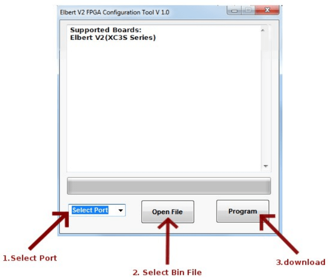 Step 1: Open Elbert V2 Configuration Tool. Select the port no. (Refer “Driver installation” for more information on finding port no.) Click Open file and select the .bin file.