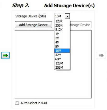 Step 2: Select the 16M in Storage Device (bits) list. Now click on “Add Storage Device”, then the green arrow at the right side.