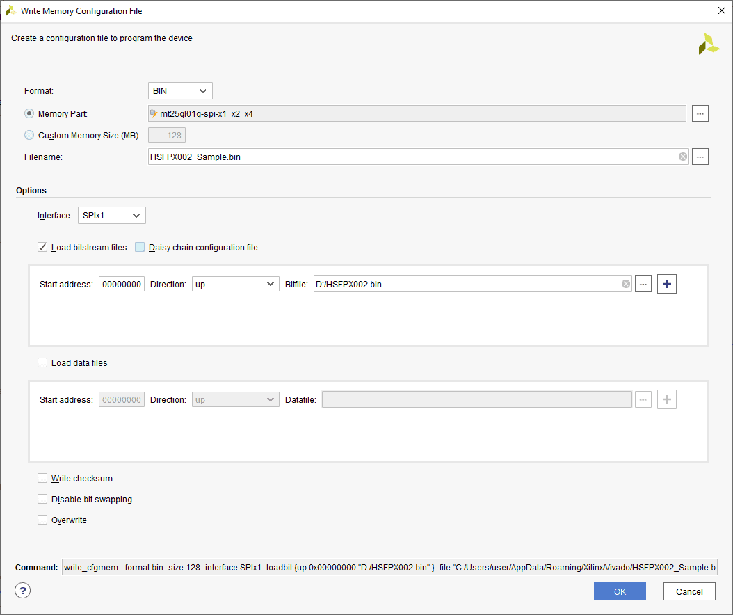 A .bin or .mcs file is required for programming HSFPX002’s onboard QSPI flash.