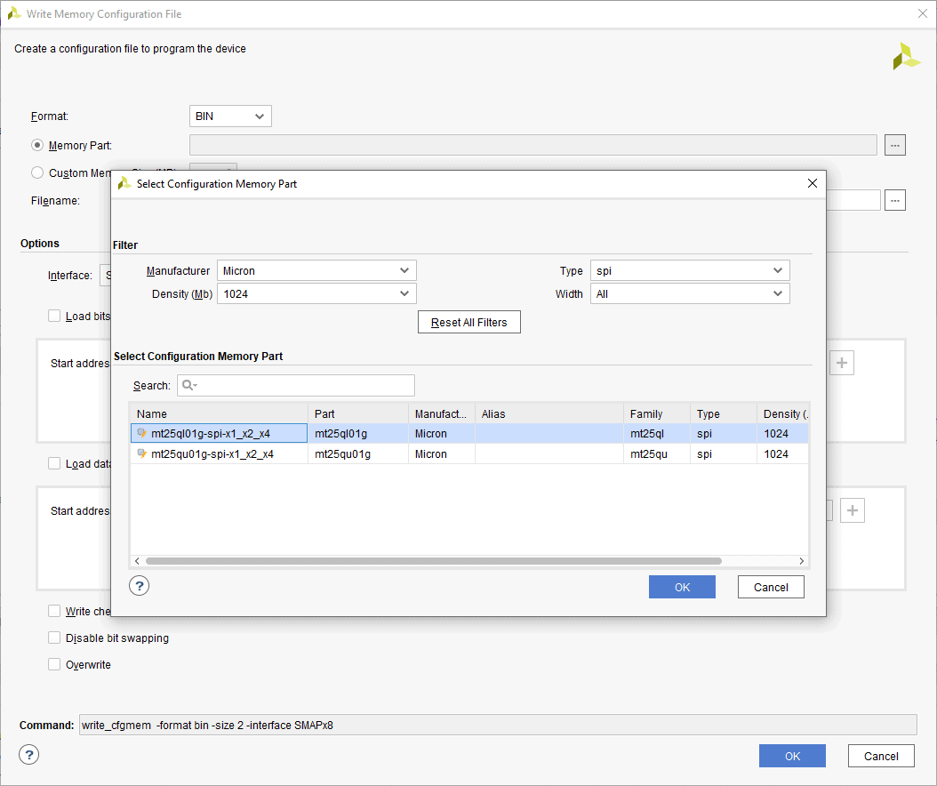 Step 3: Select the memory device “is25lp512m-spi-x1_x2_x4”, then click OK.