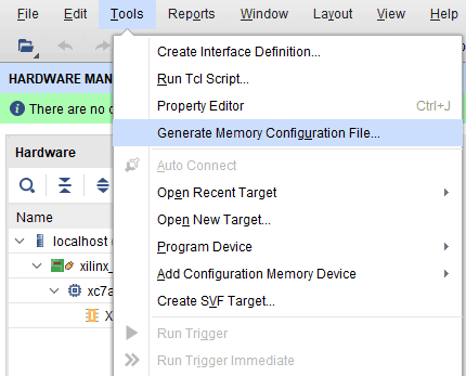 Step 1: Open Xilinx Vivado Hardware Manager. Connect the board, click “Generate Memory Configuration File….” from “Tools” menu. “Write Memory Configuration File” pop up window will open.