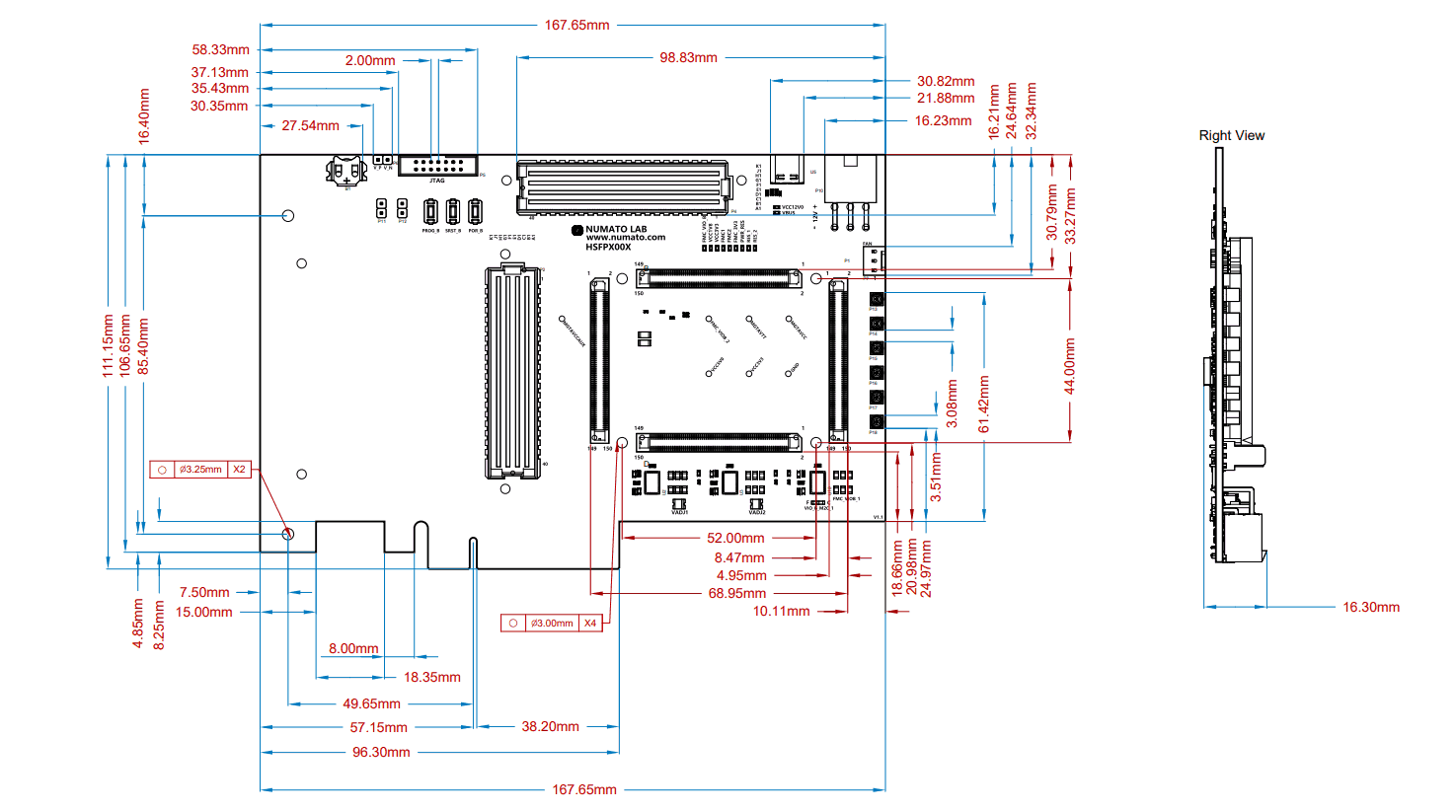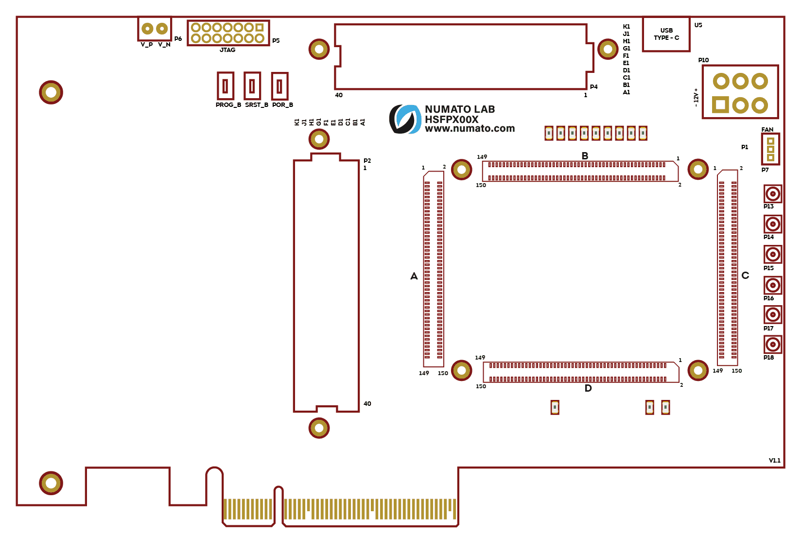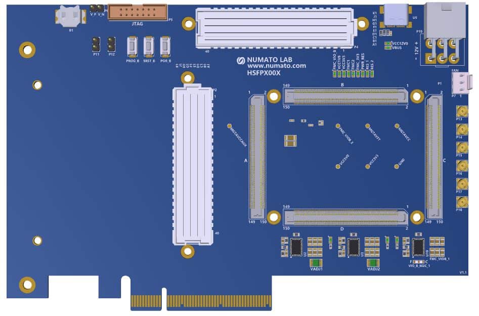The HSFPX00X is carrier board for connecting module with Edge Rate® Rugged High-Speed Male connector like Numato Lab’s HSFPX002 FPGA module. The HSFPX00X carrier board features High Pin Count (HPC) high-speed FMC connector conforming to ANSI/VITA 57.1 Standard for the purpose of adding additional features to the board by using custom or commercial off-the-shelf daughter boards and a x8 PCIe interface.