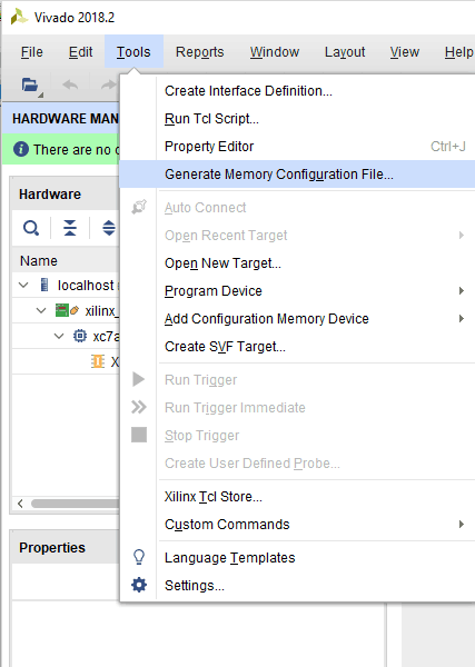 Step 1: Open Xilinx Vivado Hardware Manager. Connect the board, click “Generate Memory Configuration File….” from the “Tools” menu. “Write Memory Configuration File” pop up window will open.