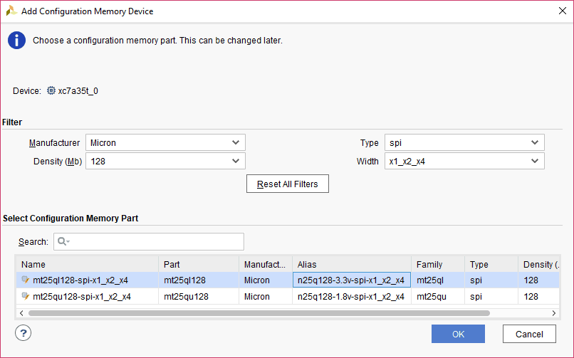 Step 3: Select the memory device “mt25ql128-spi-x1_x2_x4 (which is equivalent to n25q128-3.3v-spi-x1_x2_x4)”, then click OK.