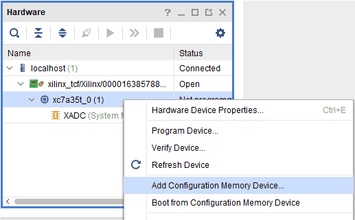 Step 2: If the device is detected successfully, it will be displayed as shown in the image below. To add Configuration Memory Device, right-click on the target device “xc7a35t_0” and select “Add Configuration Memory Device” as shown below.