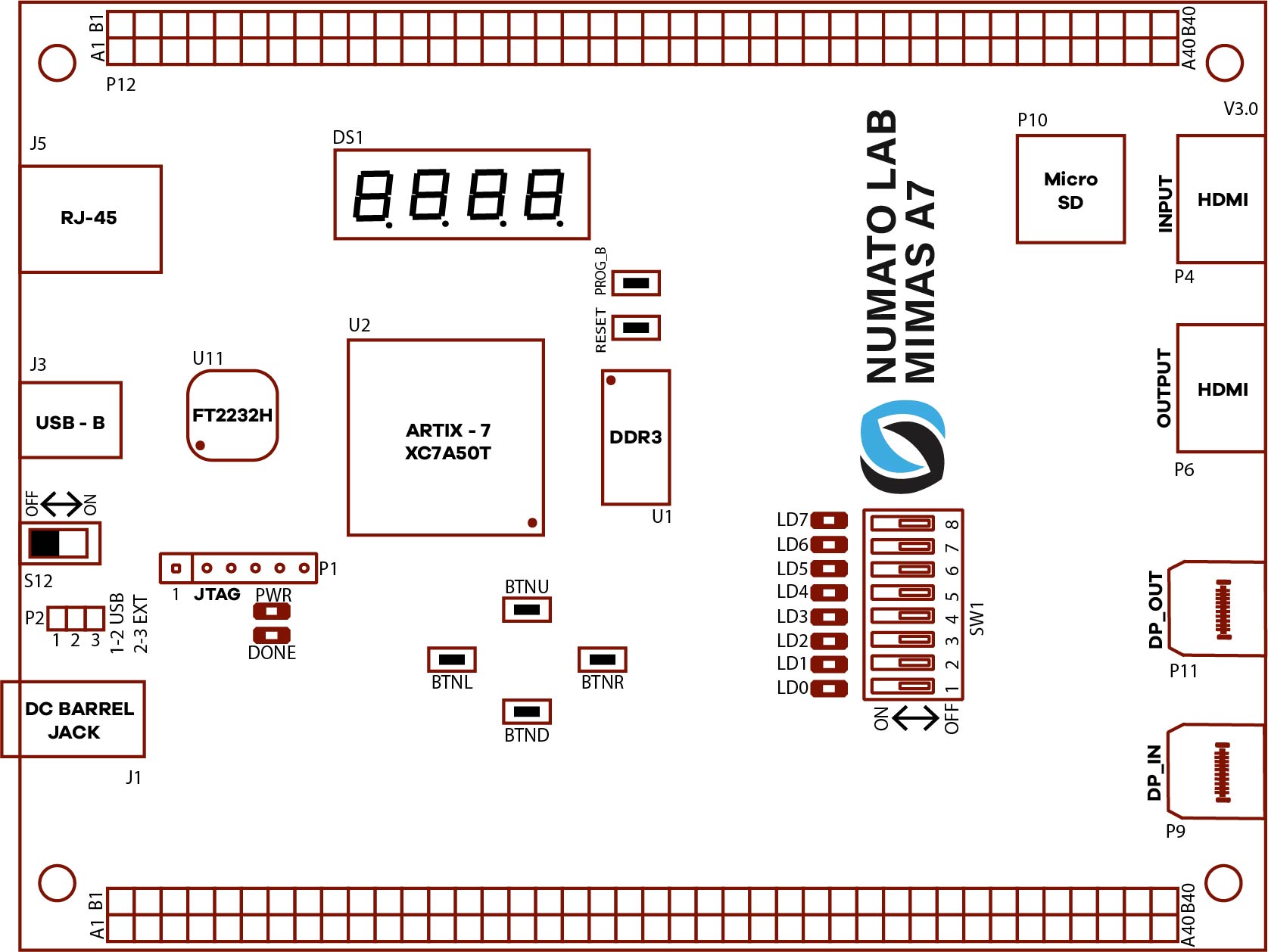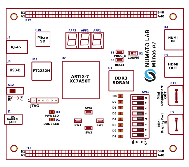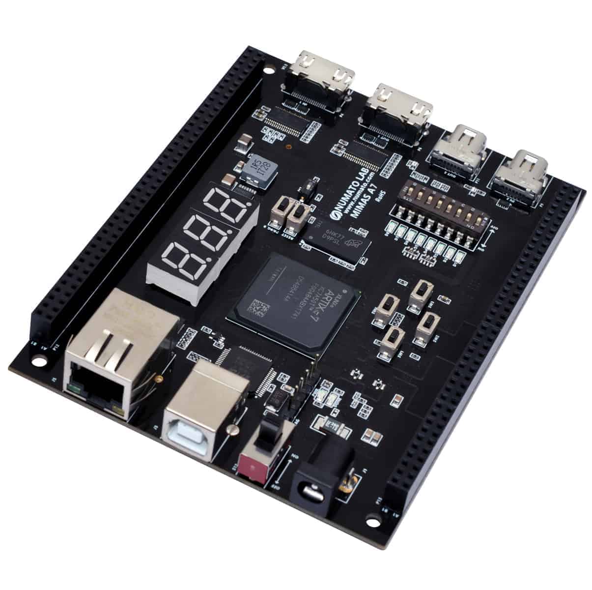 Mimas A7 is a serious upgrade to our lower-cost Mimas V2 FPGA Development board. Based on Artix 7™ 50T FPGA, Mimas A7 plenty powerful as it is versatile. This FPGA Development Board follows the philosophy of offering a large variety of peripherals on a compact form factor to allow minimal external components to run and evaluate as many designs as possible. Mimas A7 is a great platform for implementing Soft processors such as Microblaze to make it a complete embedded platform. The built-in Gigabit Ethernet offers low latency high bandwidth data transfer to host. The USB 2.0 host interface based on popular FT2232H offers high bandwidth data transfer and board programming without the need for any external programming adapters. Onboard HDMI IN/OUT interfaces along with large DDR3 SDRAM makes Mimas A7 a great platform for video capture, processing, and rendering. The staple peripherals such as switches and seven-segment displays offer great value for learning, prototyping and debugging.
