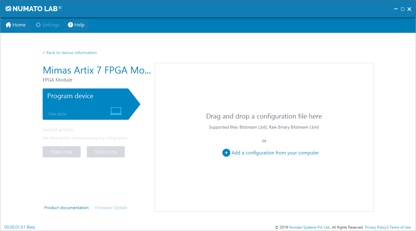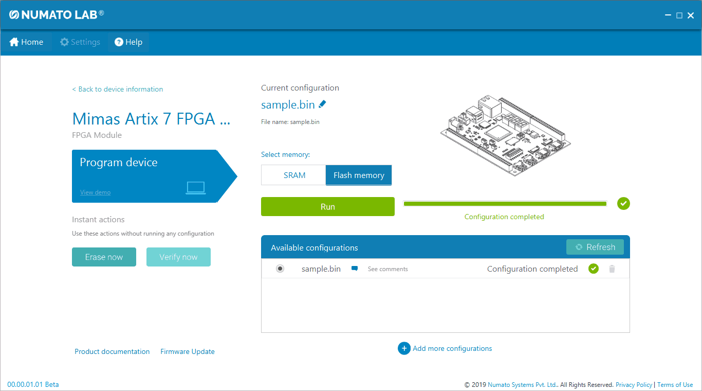 This product requires a driver to be installed for proper functioning when used with Windows. The Numato Lab Mimas A7 driver can be downloaded from here. When the driver installation is complete, the module should appear in Mimas A7 Flash Config Tool as Mimas Artix-7 FPGA Development Board.