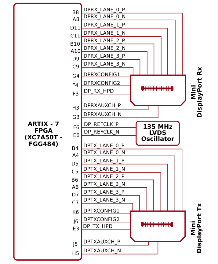 Mimas A7 includes onboard mini DisplayPort (miniDP or mDP) IN/OUT connectors and it is a miniaturized version of DisplayPort digital display technology. The mini DisplayPort is having four lanes along with auxiliary channel and a hot plug detect the signal. High-Speed Serial Interface (GTP) available on mini DisplayPort connectors.