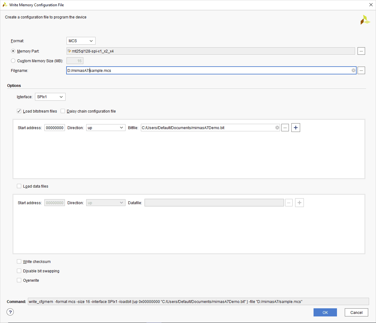 A .bin or .mcs file is required for programming Mimas A7’s onboard QSPI flash.