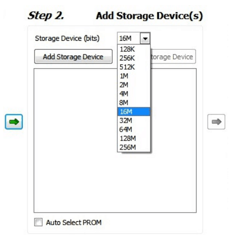 Step 2: Select the 16M in Storage Device (bits) list. Now click on “Add Storage Device”, then the green arrow at the right side.