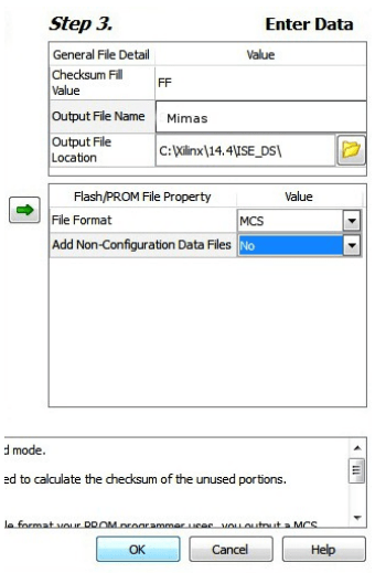 Step 3: Set an output file name and an output file location (the “.mcs” file will be generated at this location which will be required later for programming the FPGA), then click OK twice, then select the “.bit” file we already generated then click Open and click NO when it prompts to add another device file.