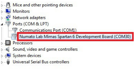 Mimas has an on-board micro-controller which facilitates easy reprogramming of onboard SPI flash through the USB interface. The micro-controller receives bitstream from the host application and program it into the SPI Flash and lets the FPGA boot from the flash. The Mimas configuration application can be downloaded from www.numato.com for free. When Mimas is connected to PC, it shows up as a COM port in Device Manager. Run configuration application, select proper COM Port before downloading bitstream. Click on “Open File” to select the bitstream file (.bin) and press the “Program” button to download the bitstream. Wait till the download process is finished. Once the download process is over, the configuration controller will try to boot the FPGA from the SPI Flash automatically. Follow the below steps.