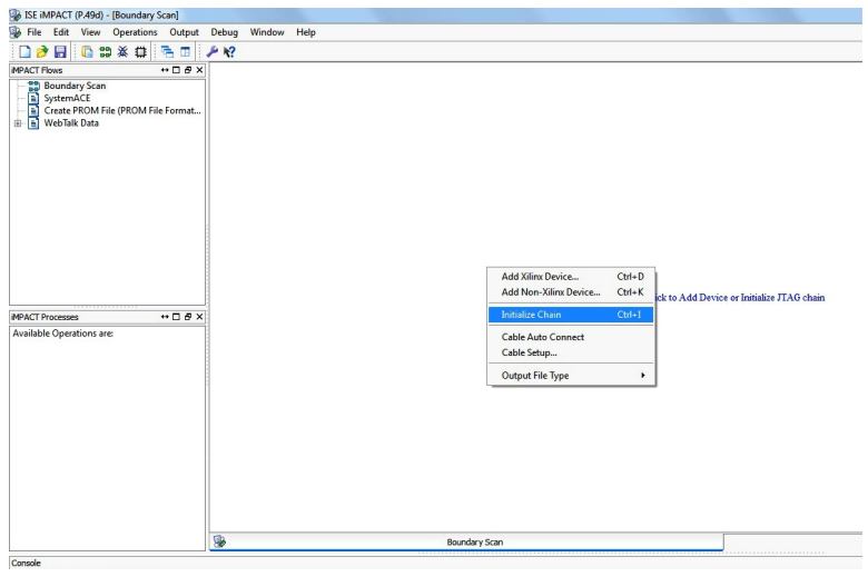 Step 1: Open ISE iMPACT. Click on “Boundary Scan” in the iMPACT flows window in the left top corner. Then right-click on the window panel on the right side. Select “Initialize Chain”.