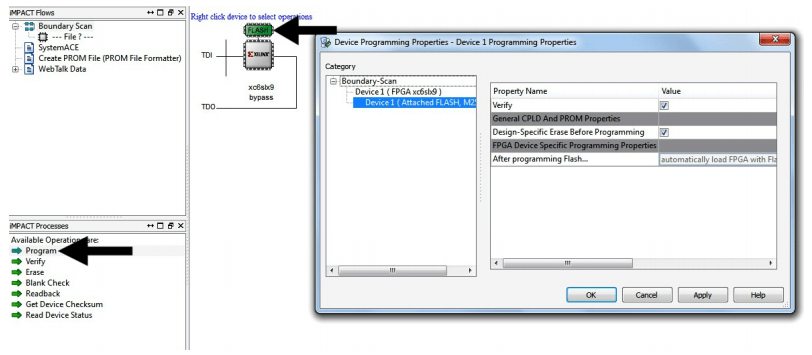Step 1: Open ISE iMPACT. Click on “Create PROM file(PROM file formatter)”.In the dialog box, select “Configure Single FPGA” in the storage device type. Then click the green arrow on the right side.