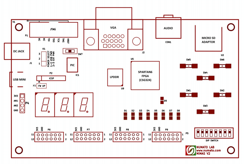 MIMAS V2 is a feature-packed yet low-cost FPGA Development board featuring Xilinx Spartan-6 FPGA. It is specially designed for experimenting and learning system design with FPGAs. This development board features SPARTAN XC6SLX9 CSG324 FPGA with onboard 512Mb DDR SDRAM. The USB 2.0 interface provides fast and easy configuration download to the on-board SPI flash. No need to buy an expensive programmer or special downloader cable to download the bitstream to the board.