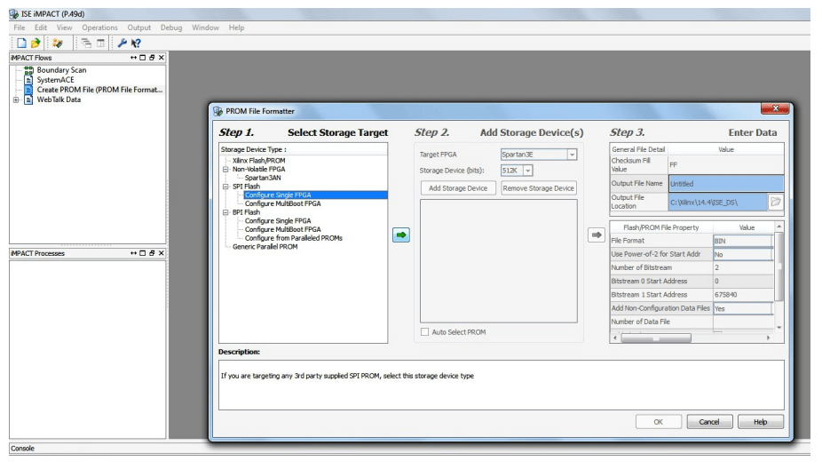 Step 1: Open ISE iMPACT. Click on “Create PROM file(PROM file formatter)”.In the dialog box, select “Configure Single FPGA” in the storage device type. Then click on the green arrow on the right side.