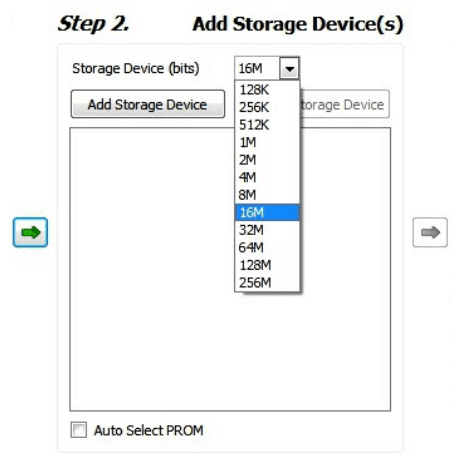 Step 2: Select the 16M in Storage Device (bits) list. Now click on “Add Storage Device”, then the green arrow at the right side.