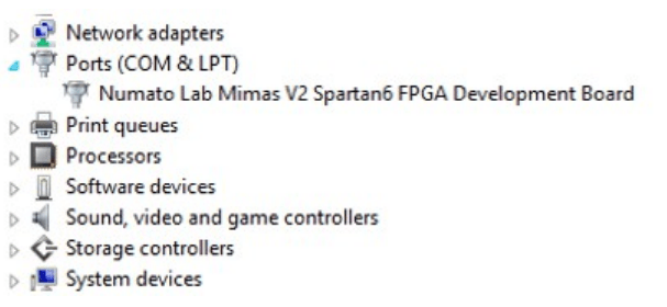 MIMAS V2 has an on-board micro-controller which facilitates easy reprogramming of onboard SPI flash through the USB interface. The micro-controller receives bitstream from the host application and program it into the SPI Flash and lets the FPGA boot from the flash. The MIMAS V2 configuration application can be downloaded from www.numato.com for free. When MIMAS V2 is connected to PC, it shows up as a COM port in Device Manager. Run configuration application, select correct COM Port before downloading bitstream. Click on “Open File” to select the bitstream file (.bin) and press the “Program” button to download the bitstream. Wait till the download process is finished. Once the download process is over, the configuration controller will try to boot the FPGA from the SPI Flash automatically. Follow the below steps.