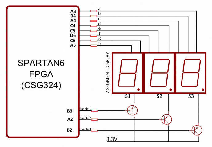 Note: All signals (a, b, c, d, e, f, g, dot, enable 1, enable 2, enable 3) used for controlling 7-Segment display are active-low signals. So, for example, for displaying “8” in display-2, users need to drive Enable 2 to 0 as well as drive signals a, b, c, d, e, f to 0. All other signals need to be driven to 1.
