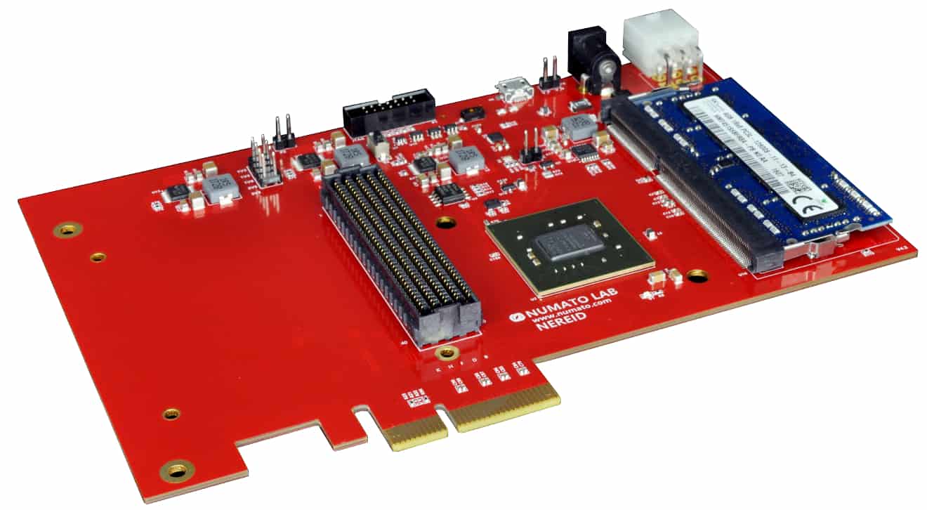Nereid is an easy to use FPGA Development Board featuring Xilinx Kintex-7 FPGA with x4 PCIe interface and 4GB DDR3L SDRAM. This board features Xilinx XC7K160T– FBG676 FPGA. Other FPGA configurations are available at request. The board features High Pin Count (HPC) high-speed FMC connector conforming to ANSI/VITA 57.1 Standard for the purpose of adding additional features to the board by using custom or commercial off-the-shelf daughter boards.