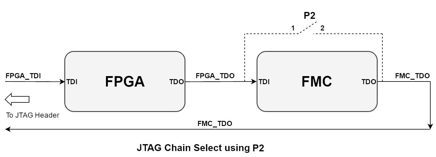 Nereid has automatic FMC detection using the PRSNT_M2C_L signal from FMC. Normally, when an FMC board is not connected, the Nereid’s onboard circuitry will automatically close the JTAG chain keeping FMC out from the chain, so no user intervention is required. But, still, jumper P2 has been provided as a redundant back up to close the JTAG chain in case the automatic circuitry doesn’t work due to non-compliant FMC modules connected to Nereid, or any or unforeseen reasons.