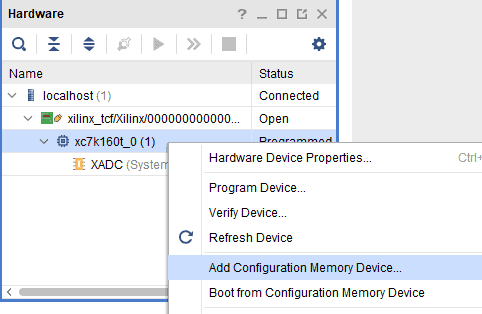 Step 2: If the device is successfully detected, then right-click on the “xc7k160t_0”. Select “Add Configuration Memory Device” as shown below.